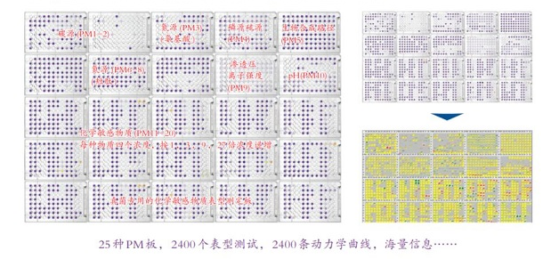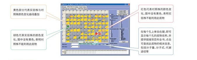 各種不同的PM平板上包被了多種活體細胞生長需要依賴的基質,因此可以進行不同生長條件下的測試。包括有C.N.P.5.滲適壓.PH值、化學藥物等基質條件下細的表型的測試,目前PM表型板25塊,測試的表型達到了2400種,已經可以用于革蘭氏陰性細菌,陽性細菌、酵母和絲狀真菌細胞表型的研究。