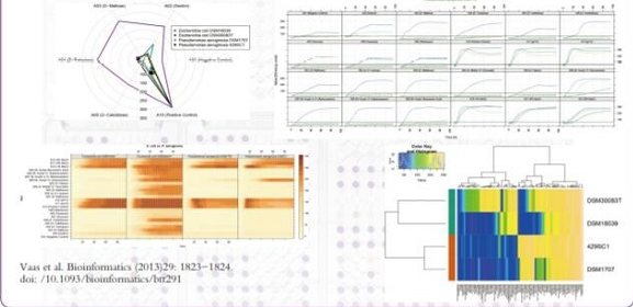 OPM是一個基于R語言環境的統計學軟件包,用于PM數據分析,提供了優化和分析動力學曲線,聚合曲線參數,記錄樣品和實驗設置的相關元數據以及用圖形和統計方法分析高度復雜的數據集等工具。該軟件包還包括95%的置信度圖,增強的熱圖圖形以及用于比較動力學曲線的定制多重比較,還可以將數據和KEGG數據庫結合分析代謝路徑等。