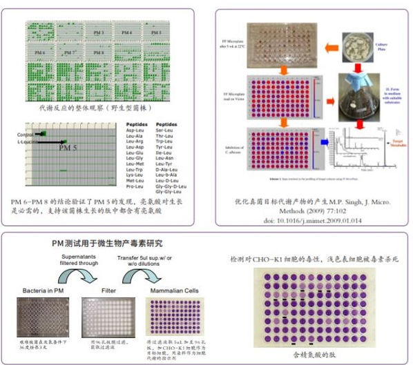 優化二級代謝產物生成條件:如抗生素,細菌、真菌毒素的產生,將PM技術與抑菌圈法、色譜法,直觀顏色判斷法或活細胞測試等相結合,通過快速確定培養后PM板每個微孔中的苗液是否含有相應的刺激代謝產物。