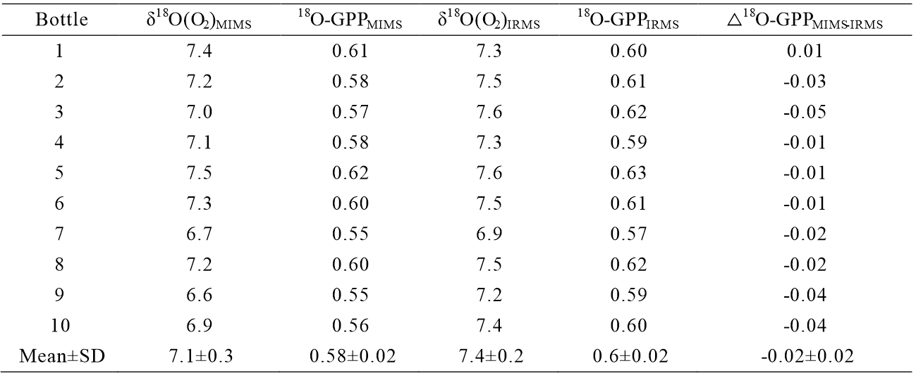 表2 MIMS與IRMS在測量海洋總初級(jí)生產(chǎn)力時(shí)的數(shù)據(jù)比較